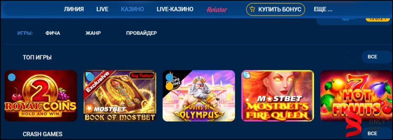 Помимо ставок на спорт, букмекер предлагает клиентам функционал интернет-казино с широким игровым ассортиментом: пользователи могут играть в слоты, карточные и настольные игры, игры с живыми дилерами, краш-игры и принимать участие в розыгрышах букмекера. После регистрации учетной записи в БК «Mostbet» игрок получает доступ к полному функционалу букмекерской конторы.